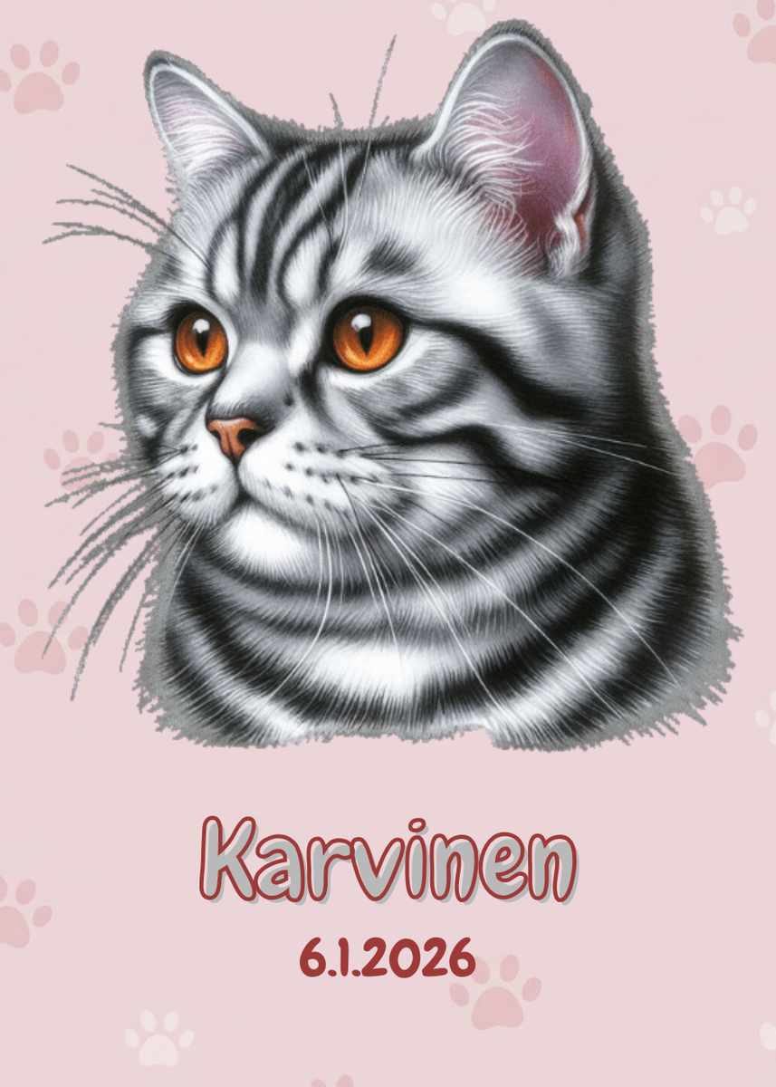 Tuo kotiisi lämpöä ja persoonallisuutta kauniilla, räätälöitävällä kissajulisteella. Tämä juliste on sydämellinen tapa kunnioittaa rakasta perheenjäsentä, oli kyseessä sitten pieni pentu tai jo edesmennyt ystävä. Voit valita julisteen taustaväriksi herkän vaaleanpunaisen tai rauhallisen sinisen.